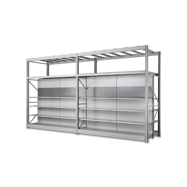 Kopstelling - H180 x B100 x D47 cm - 4 niveaus - Grijs Montagevideo: Kopstelling montage video Deze aanbouw- of beginsectie bestaat uit:- 2 staanders H140 x B3 x D6 cm RAL9006 (aanbouwsectie bevat 1 staander)- 2 verlengstukken H40 x B3 x D6 cm RAL9006 (aanbouwsectie bevat 1 verlengstuk) - 2 voeten H16 x D47 cm RAL9006 (aanbouwsectie bevat 1 voet)- 1 legplank L100 x D47 cm RAL9006 - 3 legplanken L100 x D37 cm RAL9006- 6 plankdragers D37 cm RAL9006 - 4 achterwanden glad H40 x B100 cm RAL9006 ('achterkant afgewerkt' bevat 8 achterwanden) - 1 achterwand glad H10 x B100 cm RAL9006 ('achterkant afgewerkt' bevat 2 achterwanden) - 1 plint H16 x B100 cm RAL9006/RAL5002/RAL3020/RAL1018 (optioneel bij 'bodemplint en prijsetiketten') - 1 afdekkap L100 x D6 cm RAL9006 (alleen bij ‘achterkant afgewerkt’ inbegrepen)- 4 prijsstrips L100 cm RAL9006/RAL5002/RAL3020/RAL1018 (optioneel bij 'bodemplint en prijsetiketten')