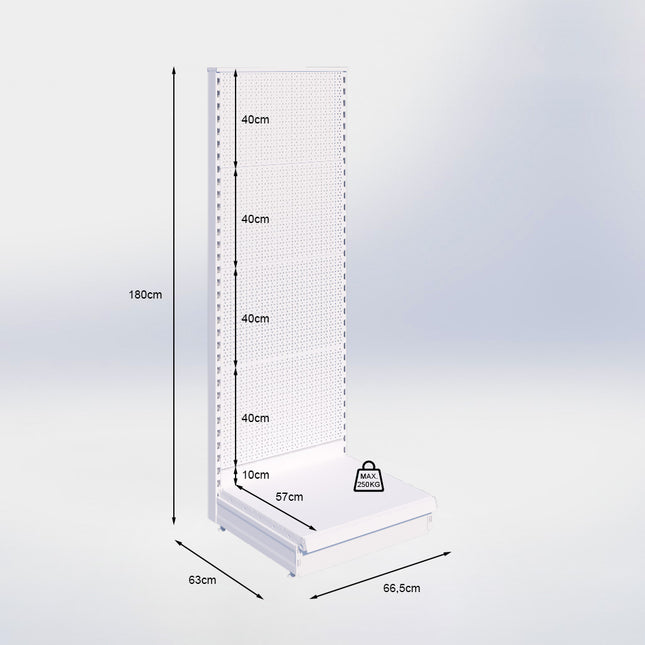 Kopstelling perforatie - H180 x B66,5 x D57 cm - 2 niveaus - Grijs Montagevideo: Kopstelling montage video Deze aanbouw- of beginsectie bestaat uit:- 2 staanders H140 x B3 x D6 cm RAL9006 (aanbouwsectie bevat 1 staander) - 2 verlengstukken H40 x B3 x D6 cm RAL9006 (aanbouwsectie bevat 1 verlengstuk) - 2 voeten H16 x D57 cm RAL9006 (aanbouwsectie bevat 1 voet) - 1 legplank L66,5 x D57 cm RAL9006- 1 legplank L66,5 x D47 cm RAL9006- 2 plankdragers D47 cm RAL9006- 3 achterwanden geperforeerd H40 x B66,5 cm RAL9006('achterkant afgewerkt' bevat 6 achterwanden)- 1 achterwand glad H40 x B66,5 cm RAL9006 - 1 achterwand glad H10 x B66,5 cm RAL9006('achterkant afgewerkt' bevat 2 achterwanden) - 1 plint H16 x B66,5 cm RAL9006/RAL5002/RAL3020/RAL1018 (optioneel bij 'bodemplint en prijsetiketten')- 1 afdekkap L66,5 x D6 cm RAL9006 (alleen bij ‘achterkant afgewerkt’ inbegrepen)- 2 prijsstrip L66,5 cm RAL9006/RAL5002/RAL3020/RAL1018 (optioneel bij 'bodemplint en prijsetiketten')
