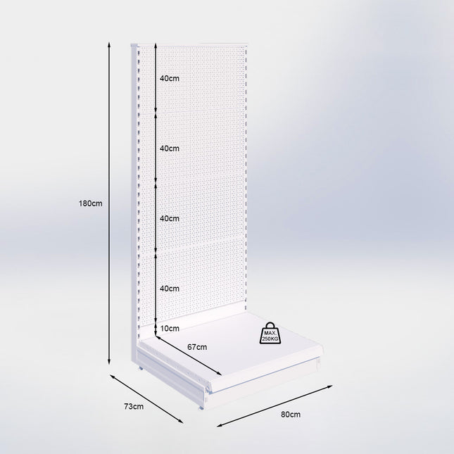 Kopstelling perforatie - H180 x B80 x D47 cm - 2 niveaus - Grijs Montagevideo: Kopstelling montage video Deze aanbouw- of beginsectie bestaat uit:- 2 staanders H140 x B3 x D6 cm RAL9006 (aanbouwsectie bevat 1 staander) - 2 verlengstukken H40 x B3 x D6 cm RAL9006 (aanbouwsectie bevat 1 verlengstuk) - 2 voeten H16 x D47 cm RAL9006 (aanbouwsectie bevat 1 voet) - 1 legplank L80 x D47 cm RAL9006- 1 legplank L80 x D37 cm RAL9006- 2 plankdragers D37 cm RAL9006- 3 achterwanden geperforeerd H40 x B80 cm RAL9006('achterkant afgewerkt' bevat 6 achterwanden)- 1 achterwand glad H40 x B80 cm RAL9006 - 1 achterwand glad H10 x B80 cm RAL9006('achterkant afgewerkt' bevat 2 achterwanden) - 1 plint H16 x B80 cm RAL9006/RAL5002/RAL3020/RAL1018 (optioneel bij 'bodemplint en prijsetiketten')- 1 afdekkap L80 x D6 cm RAL9006 (alleen bij ‘achterkant afgewerkt’ inbegrepen)- 2 prijsstrip L80 cm RAL9006/RAL5002/RAL3020/RAL1018 (optioneel bij 'bodemplint en prijsetiketten')